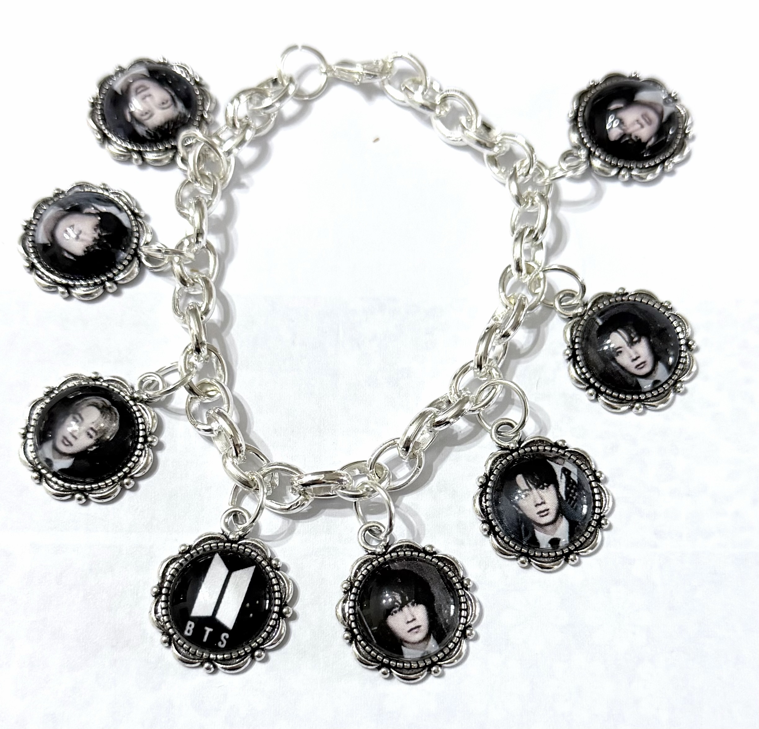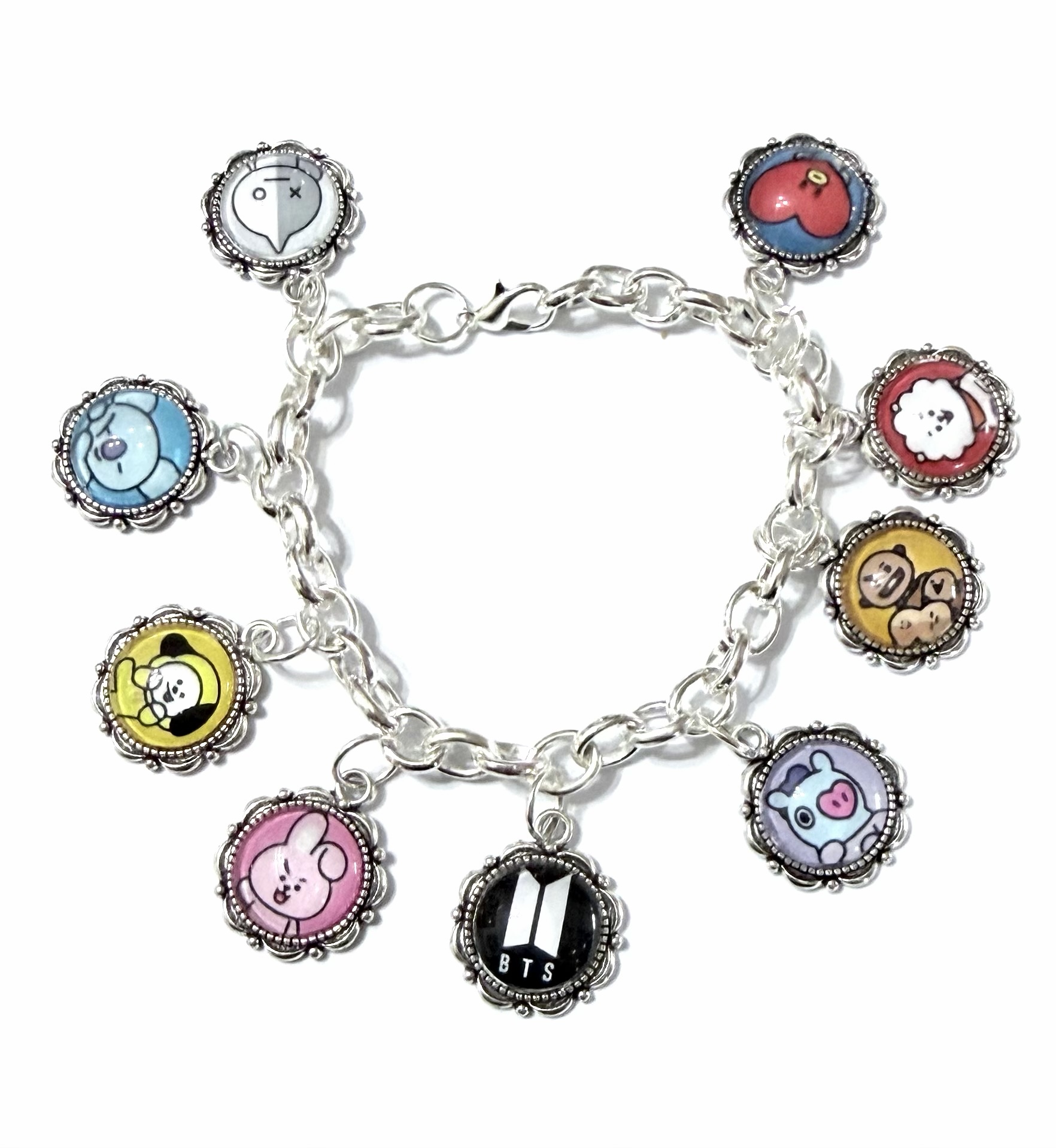 20cm silver plated non tarnish and nickel free chain with lobster clasp and charms of the bts crew or their characters